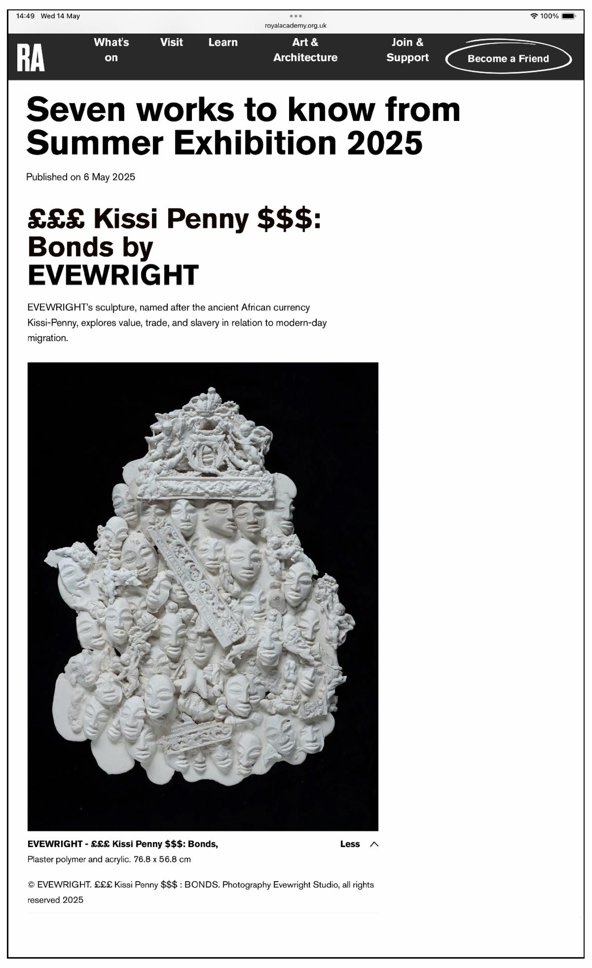 | | © EVEWRIGHT. Image above. £££ Kissi Penny $$$ : Bonds. Material; Plaster Polymer and Acrylic. Also available as a limited edition archival C-type Prints. Height 200 × 150cm, 5 plus 1 artist proof. £££ Kissi Penny $$$ : Coin with Soul. Material; Bronze Height 50.2 × Width 30 x Depth 15cm, available as a limited edition of 12 of which 9 are currently available at the Royal Academy. Image courtesy of the Artist EVEWRIGHT featured at the Royal Academy Preview Party. Evewright Studio all rights reserved 2025. | | |