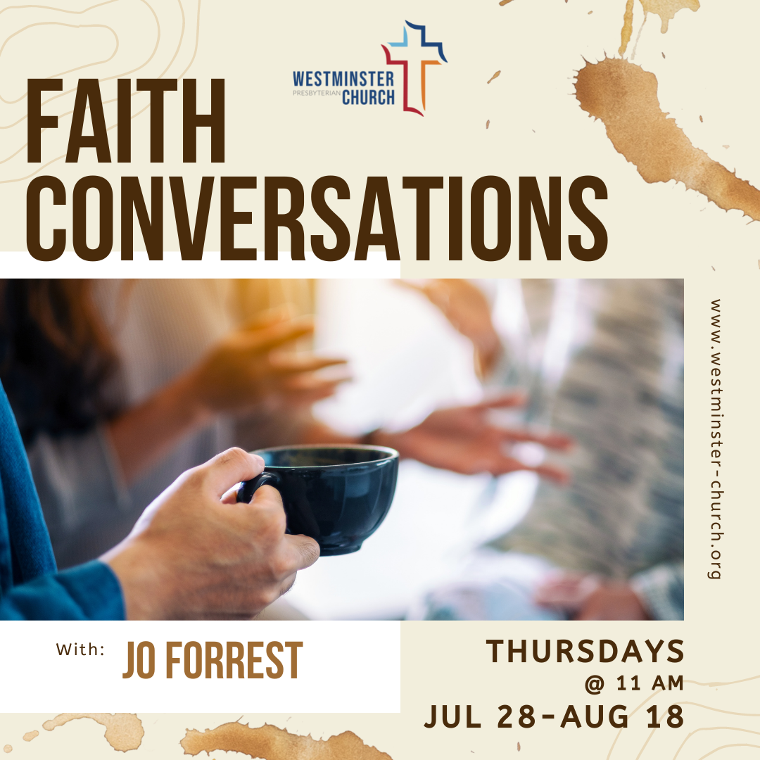 Join Jo Forrest for one or all in a series of casual conversations this summer. We will begin with a particular topic within our faith vocabulary and take ourselves where the conversation leads. Very informal. No homework. Drop in as you are able. Bring along your little ones.