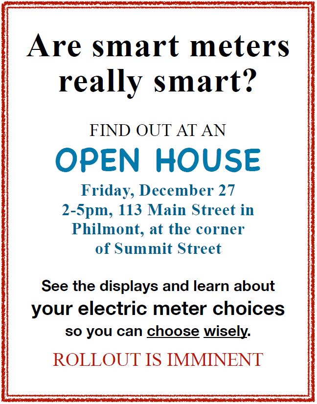 You have a choice. Please drop by and learn about 'smart' meters and some of the community's concerns. The Open House will be on Friday, December 27, 2-5pm at the storefront on the corner of Summit St. and Main St. in Philmont, NY. Important information is now on display in the windows, and additional Open House dates might be posted. Account holders can call the power company to place an order to opt-out of the 'smart' meter and KEEP their analog meter (with the spinning disk). We hope the Open House will provide the community with the opportunity to learn from the available information to make an informed decision about which meter they want servicing their home. Opting out of having a smart meter installed on our property is the wise thing to do, for ourselves and for the sake of our neighbors, too.