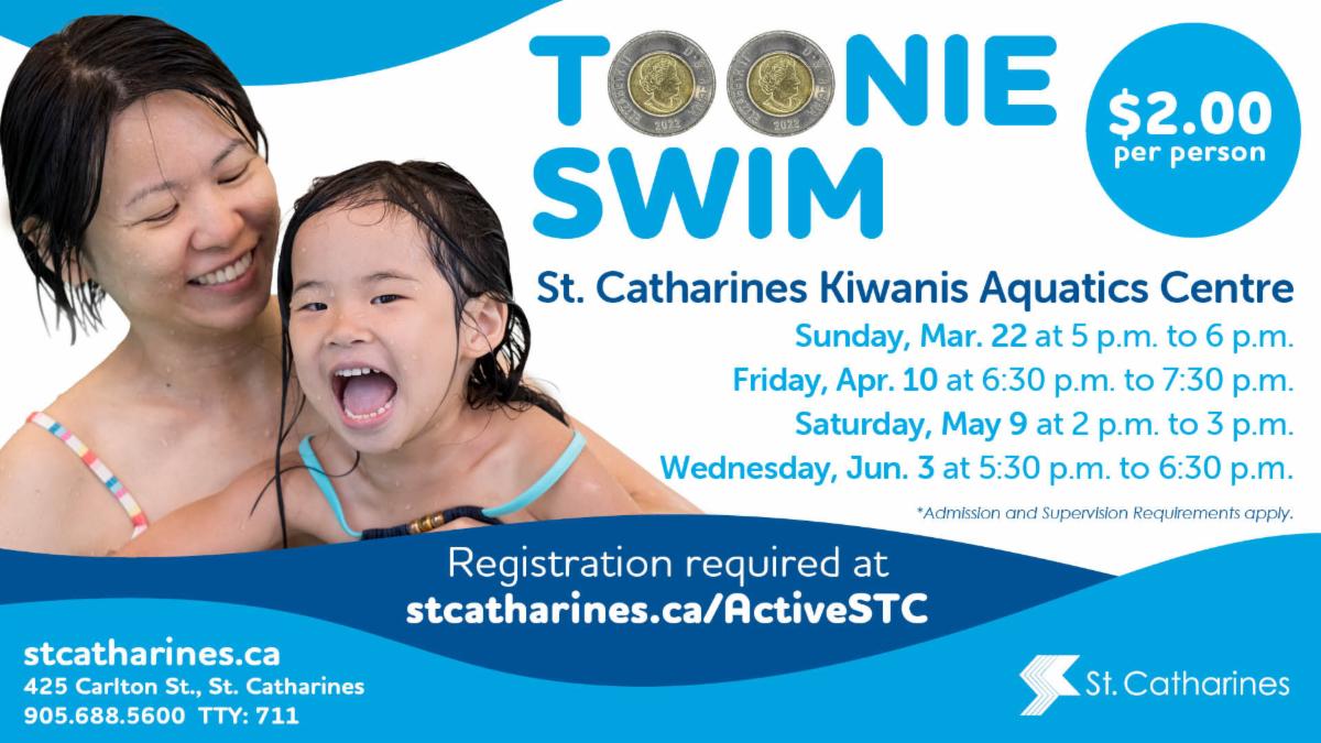 Registration for residents of St. Catharines will open online on ActiveSTC on Tuesday, March 24 at 6 p.m. Residents can register in person at the St. Catharines Kiwanis Aquatics Centre on Wednesday, March 25, 8:30 a.m.
