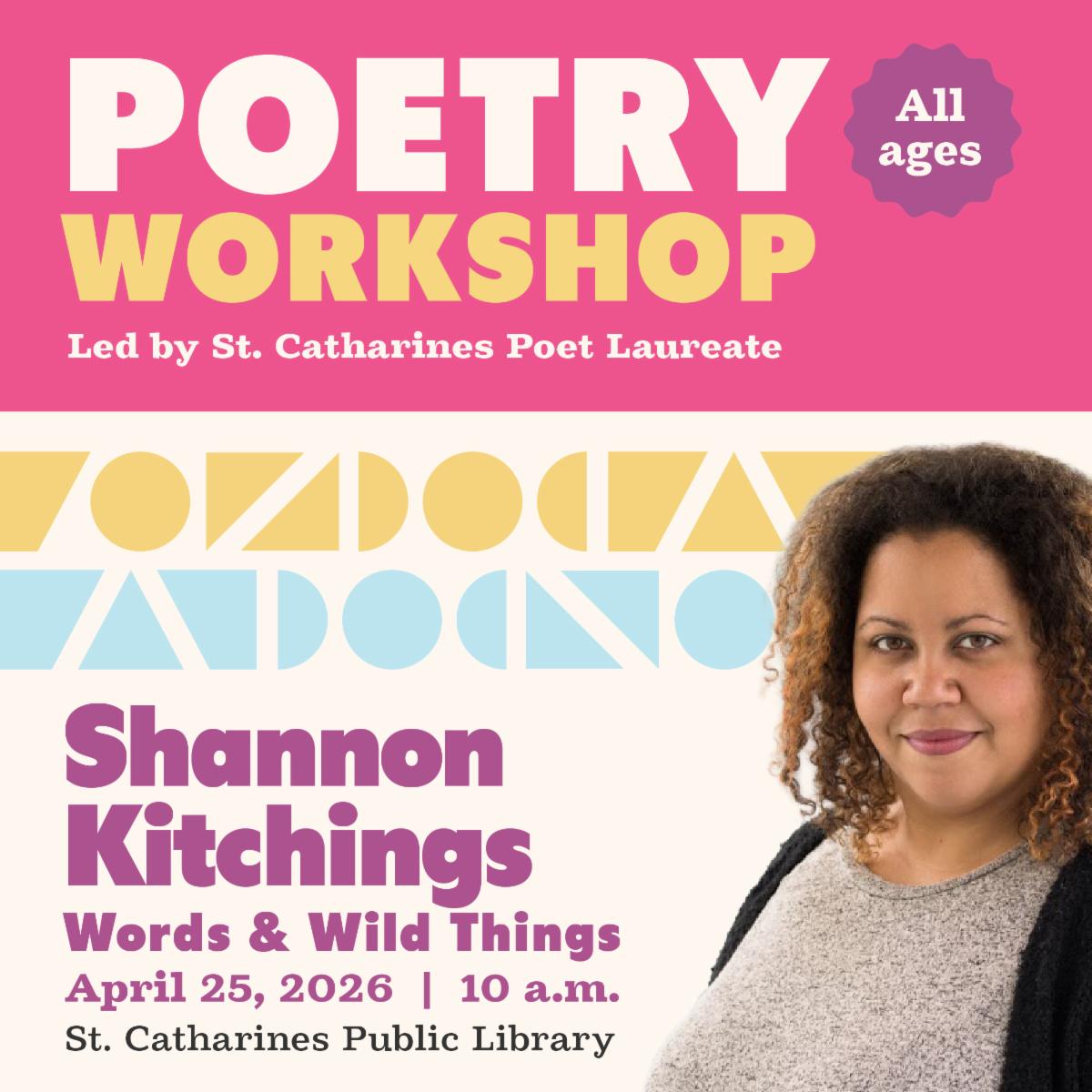 The workshop is part of a series of initiatives recognizing National Poetry Month and highlighting the City’s commitment to arts and culture. The workshop is free with all materials provided. More information is available at stcatharines.ca/poetlaureate.
