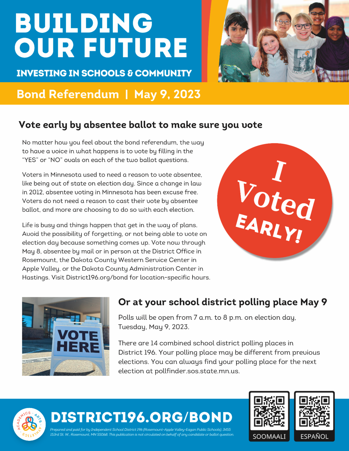 District 196 Bond Referendum Update District 196 is having a bond referendum special election for facilities and equipment improvements. If you are an eligible voter in District 196, you can vote now through election day May 9. You can vote absentee in person, during normal business hours through May 8, at the District Office in Rosemount, the Dakota County Western Service Center in Apple Valley, and the Dakota County Administration Center in Hastings. You can also absentee vote by mail, but it takes additional time and returned ballots must be received by May 8. Either way, to vote absentee you need to fill out the one-page 2023 Minnesota Absentee Ballot Application form, which asks for your driver’s license # and last four digits of your SS#. Fill out the form before you arrive to streamline the process. Life is busy. Things happen that get in the way of plans. No matter how you feel about the bond referendum, vote early to make sure you vote in this important special election. If you do wait until election day, you can find your school district polling place at pollfinder.sos.state.mn.us. More information on voting and the need for more space in District 196 are included in the third and final bond referendum flier.