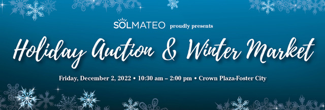Kick off the holiday season at SolMateo’s Holiday Auction and Winter Market on Friday, December 2nd from10:30 AM – 2:00 PM at the Crown Plaza - Foster City. Join us at our reimagined fund-raising event while you enjoy small bites and gourmet food stations, festive beverages, seeing friends old and new and shopping with select Bay Area artisans. This year’s raffle prizes include green quartz and diamond earrings from Kerns, a suede and leather Gucci shoulder bag donated by Innowave Marketing Group and 6 months of floral delivery from Blooming Vase. The live auction will led by Representative, Jackie Speier.