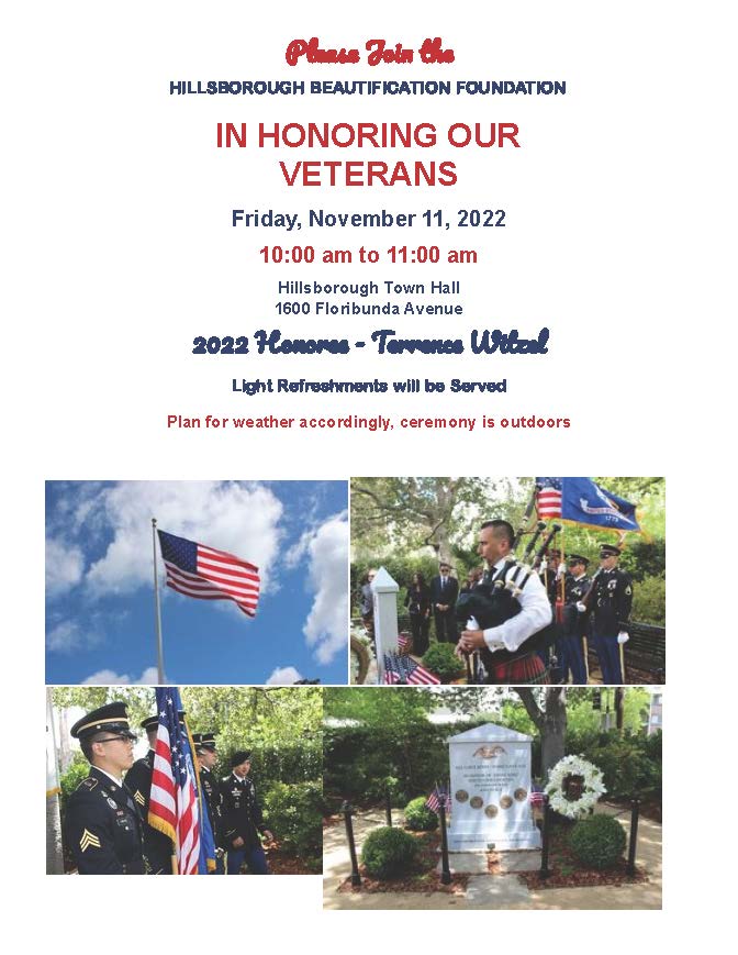Don your patriotic colors and come celebrate Veterans Day with HBF and your fellow Hillsborough residents on Thursday, November 11th at 10:00 at Town Hall. Our ceremony will feature the Swing Set, Cub Scout Pack 58, a bagpiper player and honorary wreath laying. This year we feature our local hero and veteran, Terry Witzel. This ceremony will be outside, please dress accordingly. We hope to see you there.