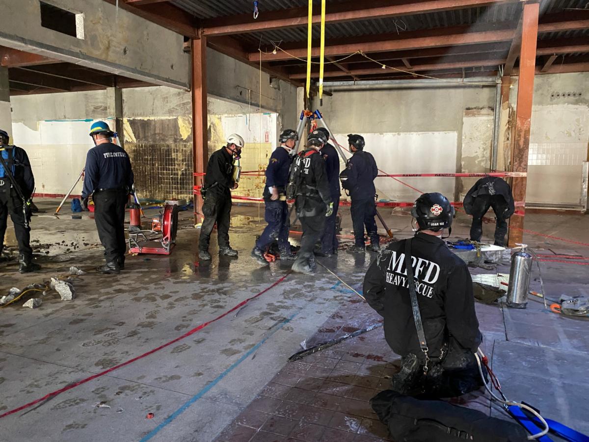 On October 25, CERT volunteers from Burlingame, Hillsborough and Millbrae were invited to observe a countywide Urban Search and Rescue drill located in a building on Burlingame’s bayfront that is scheduled for demolition. During the exercise, firefighters from the Central County Fire Department (CCFD), as well as San Bruno, South San Francisco, Menlo Park, Woodside and the San Mateo Consolidated Fire Department, rescued two injured “victims” by punching a hole in an outside wall, then jackhammering an opening in a concrete floor. CCFD Chief Bruce Barron, Deputy Chief Ken Giacotto and Community Risk and Resiliency Specialist Dena Gunning explained what was going on. While the drill was in progress, everyone’s phones lit up with an alert that a 5.1 magnitude earthquake had occurred near San Jose.