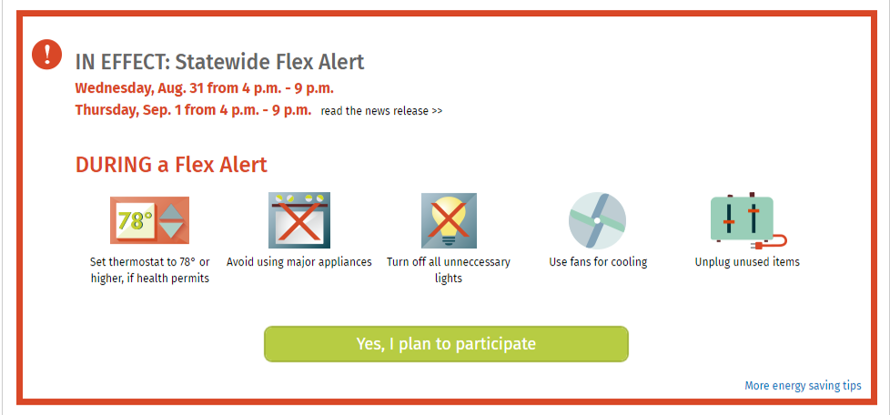 The California Independent System Operator (ISO) has issued a statewide Flex Alert, a call for voluntary electricity conservation on Thursday, September 1st. Click here for more information.