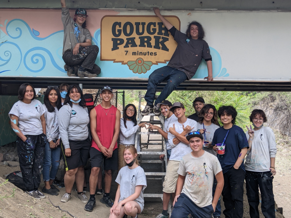 The mural beautifies the area and also serves as directional signage for trail walkers. The youth, under direction of Jess DeMoss of Scratch Paper Signs, created a wonderful riparian-themed mural that includes a whimsical sun and moon with mustaches! |