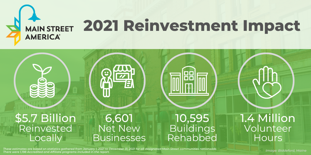 In 2021, Main Street America programs generated $5.76 billion in local reinvestment, helped open 6,601 net new businesses, generated 30,402 net new jobs, catalyzed the rehabilitation of 10,595 historic buildings, and leveraged 1,427,729 volunteer hours.