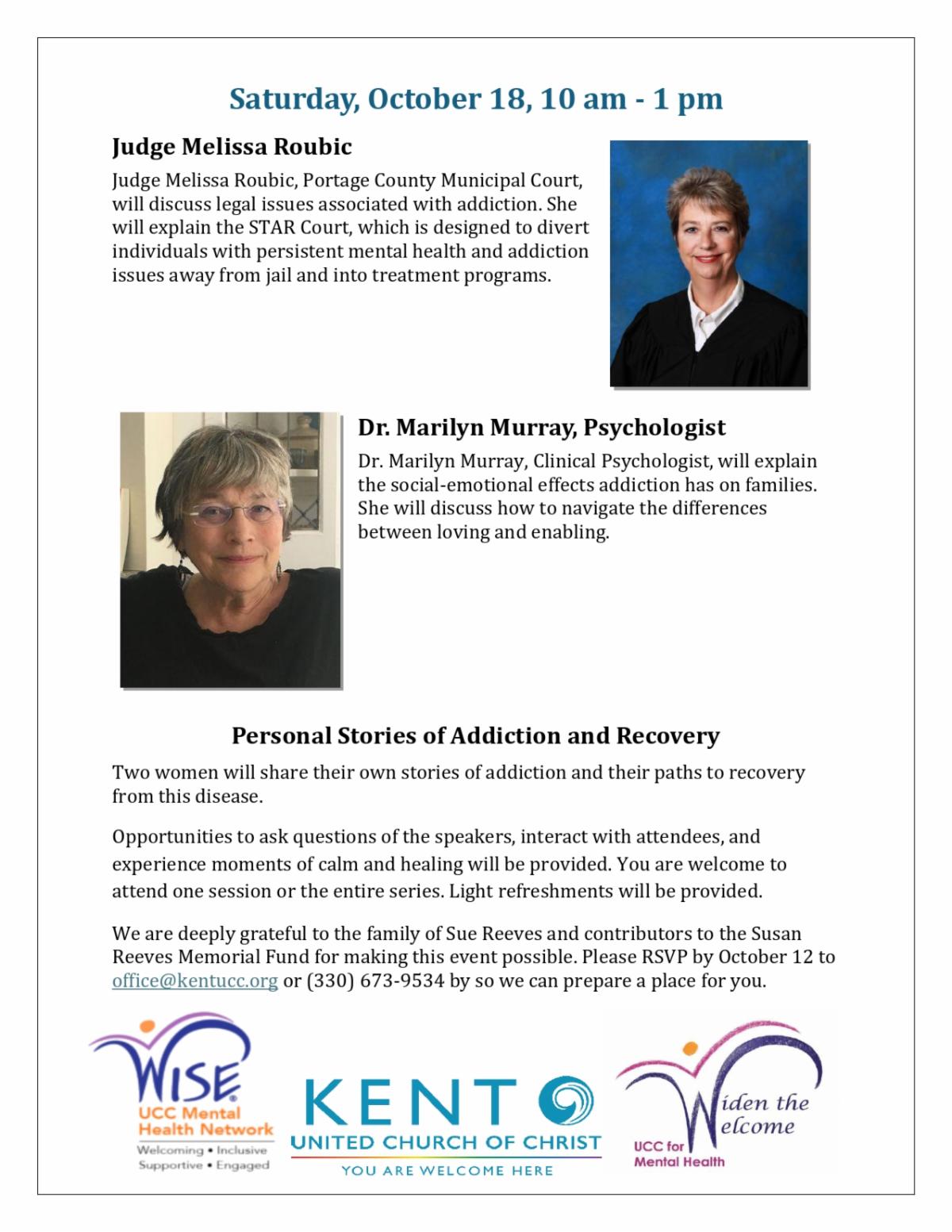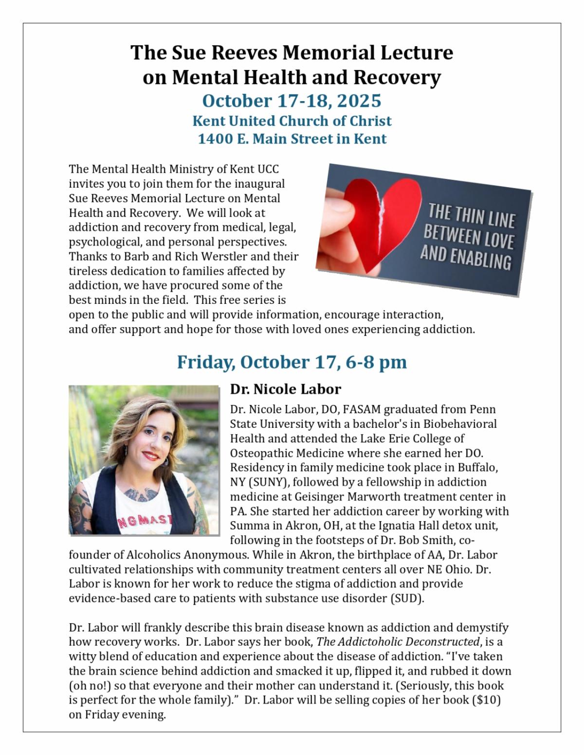 - Friday, October 17 – Saturday, October 18 – Sue Reeves Memorial Lecture on Mental Health & Recovery organized by the Mental Health Ministry