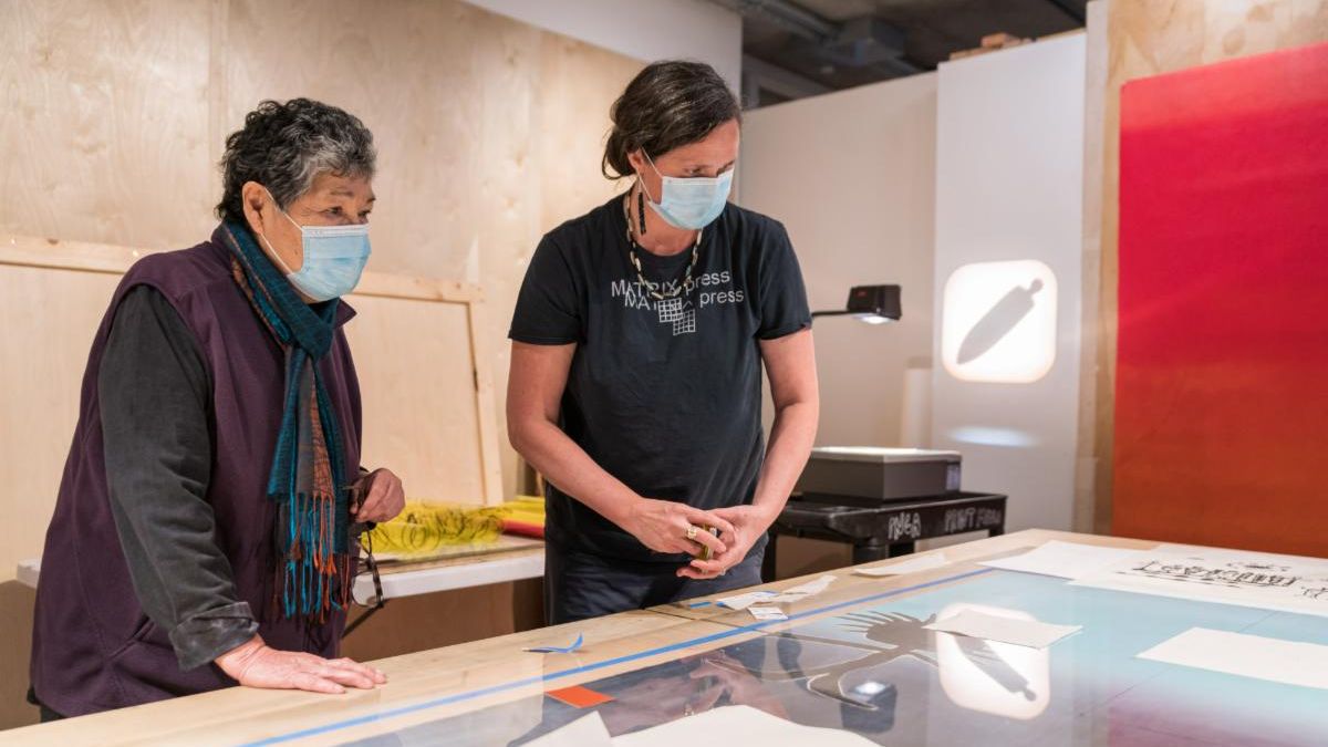 Photo: Sara Siestreem (Hanis Coos) working on a print with her lifelong mentor, Lillian Pitt (Warm Springs, Wasco, Yakama) |