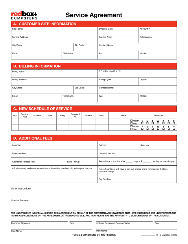 Use this fillable PDF when you are setting up a new agreement with a permanent/long-term rental client, or for any industrial dumpster contracts.