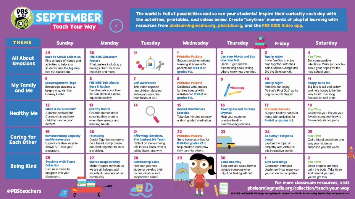 | Have fun while learning all month long! Use this PBS KIDS September activity calendar to explore something new each day of the month. |
