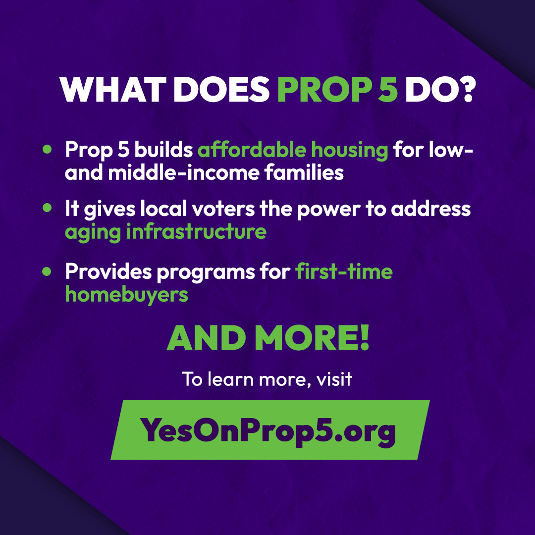 Prop 5 will also support critical infrastructure projects like parks, fire stations, and water resources that are needed for future housing developments. By passing Prop 5, we are making it easier to build the homes our community desperately needs while ensuring better public services for all.