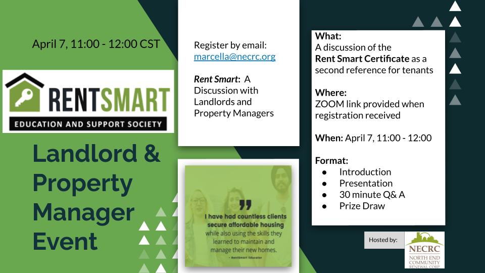 RentSmart is hosting a discussion of the RentSmart certificate as a second reference for tenants on April 7th from 11am to 12pm. To register email Marcella Poirier at marcella@necrc.org. |