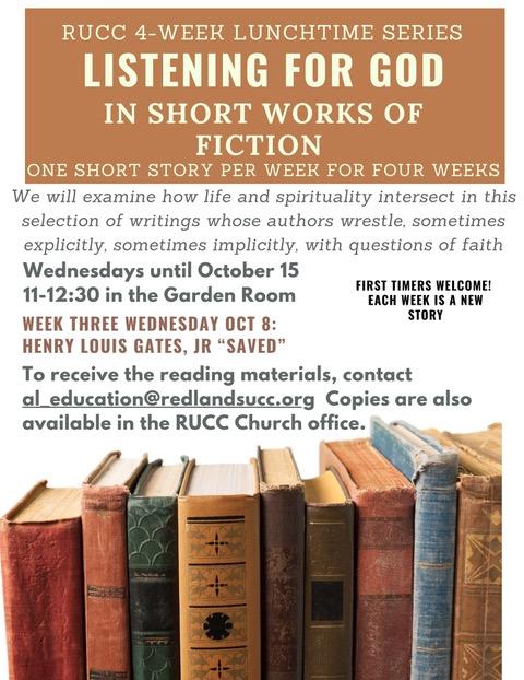 The RUCC Book Group will meet this Sunday, Oct. 5, at noon, in Founders Room (off Covenant Hall). The group will be discussing the book All the Broken Places by John Boyne and the presenter will be Susan Matthews.