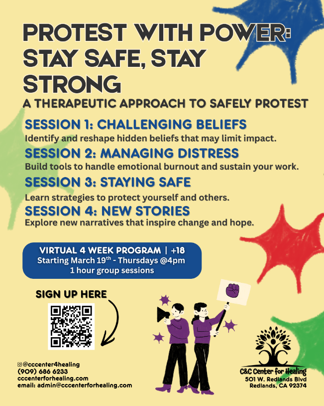 At the first quarter meeting of RUCC Wider Ministries in 2026, we decided to send a donation to four nonprofit organizations, including the C&C Center for Healing. The C&C Center for Healing was founded in 2018 and is a behavioral health clinic in Redlands that provides individual, couples, and family therapy, as well as medication and case management to various communities, including LGBT+, undocumented, and those struggling with housing. They also support the community in other ways, providing food boxes, clothing, and backpacks with essential items for the unhoused, resource fairs, and Christmas toy giveaways. RUCC prides itself on supporting anyone, regardless of where they are in their spiritual journey, and we provided $500 in Stater Brothers gift cards to support families who are struggling. The flyer is for an ongoing series on Protest with Power. It's an open group, so people can come to any or all of the sessions. Just sign up using the QR Code on the flyer. https://cccenterforhealing.com/