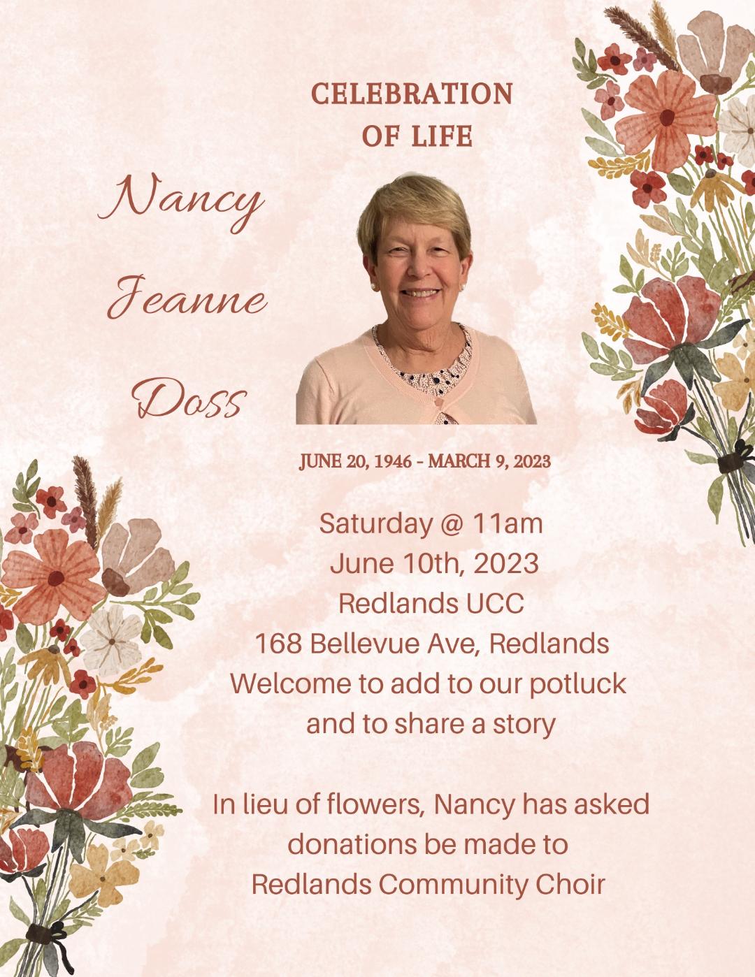 June 10 - Celebration of Life for Nancy Doss 11:00 a.m.