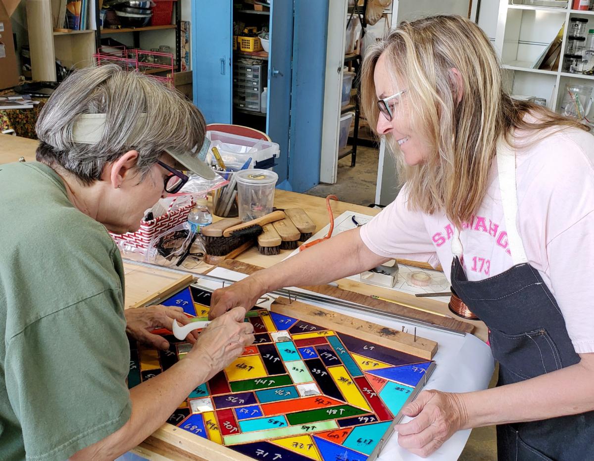 After a few Beginning Glass Fusing classes, the advanced students work on bigger projects or more difficult projects. Students come with their own ideas, sketch them out (ideally) and we will get them into glass. Advanced students often search out colored glass supplies as part of the process to be learned, and buy their own colors. We use glass compatible with a 96 coefficient of expansion (COE).