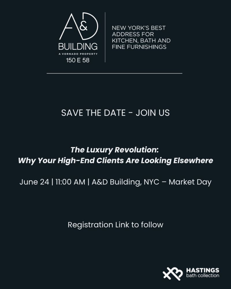 Join Bob Gifford of Hastings Bath Collection and Pamela McNally for a thought-provoking panel during A&D Market Day, June 24 at 11:00am in Hastings' showroom. “The Luxury Revolution: Why Your High-End Clients Are Looking Elsewhere” dives into shifting mindsets and what it means for your business. Prepare to be challenged—and inspired.