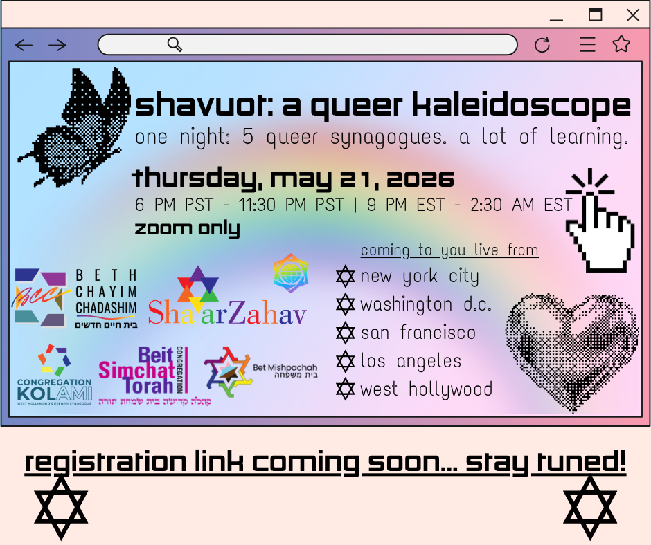 Join us on Zoom as we complete a late night Shavuot study session with Queer shuls from across the United States! Stay tuned for more details and a registration link coming soon!