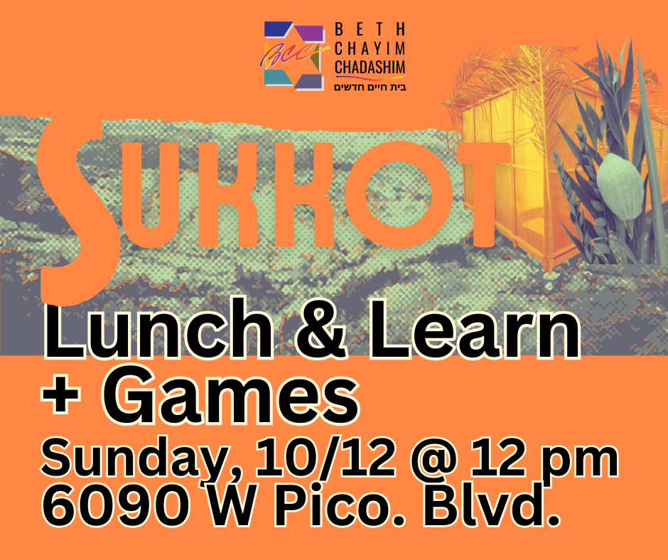 Join us for a community prepared lunch in the BCC in the Sukkah with a little learning followed by board games and more together afterwards! Do you want to come early and help prepare lunch? Be in touch with Nicolasa Nevarez.