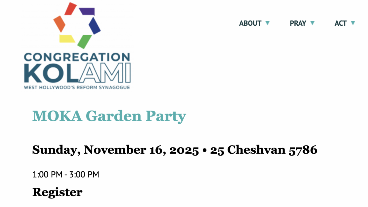 Join the Men of Kol Ami (MOKA) together with BCC for an afternoon Garden Party at a private home in Santa Monica. Enjoy a delicious catered lunch from California Chicken Cafe, games and a relaxing afternoon. $25 with reservation by November 13. Address upon Reservation. Click here to register!