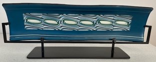 Hegland Glass Studio named piece, with custom stand. “River’s Edge” is 4.5" x 17”. Artists’ (Dave and Patti Hegland) statement: “The piece was designed to provide a sense of motion within a tranquil environment. The pieces began with the creation of a complex “pattern bar” that forms the cream, powder blue, steel blue, green, and clear inclusions at the center of the piece. The steel blue surround intensifies the central flow design.” This piece was purchased 10 – 12 years ago; documentation included. Minimum bid TBD. Pam Cleary