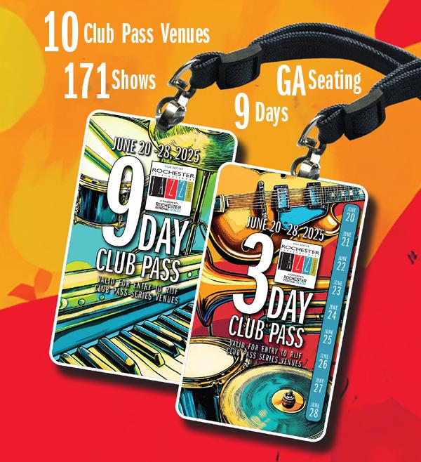 Club Passes are $214+ $6 service charge for 3-Day Passes and $324 + $6 service fee for 9-Day Passes. Buy online at rochesterjazz.com/tickets, on the App, or call (585) 454-2060. Also available at the Festival Ticket Shop at 100 East Avenue from June 16-19, daily noon- 5 p.m. and noon to 9 p.m. during the festival, June 20-28.