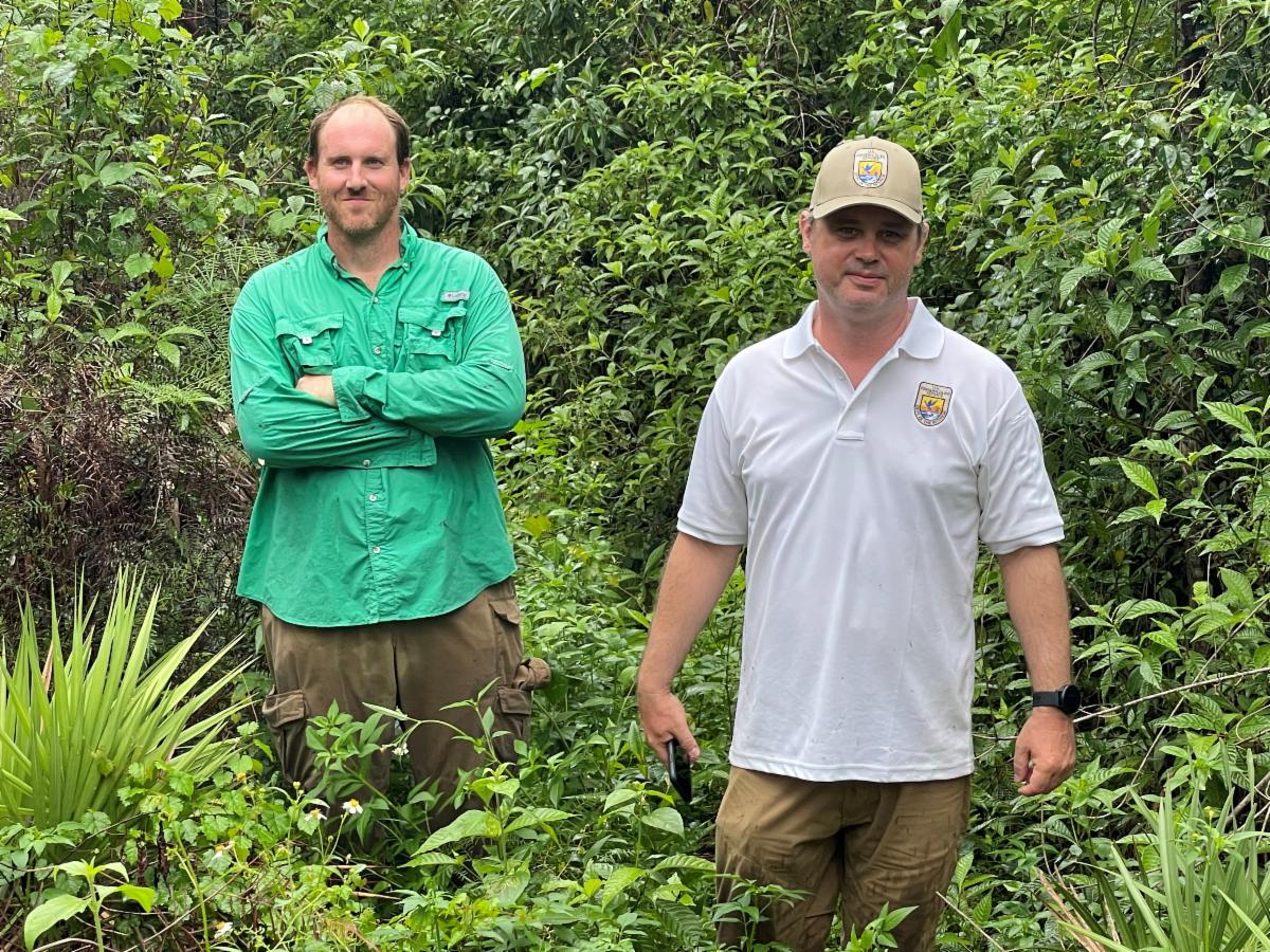 | Kevin Kalasz from the FWS Coastal Program and Alex Seasholtz, IRC Ecological Restoration Team Leader, walk though a fire-suppressed pine rockland fragment in southern Miami-Dade County. Restoration of these degraded pinelands is only possible with support from FWS and partners such as the Miami-Dade County Environmentally Endangered Lands (EEL) Program. |
