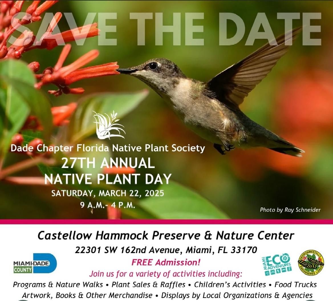 Join IRC at the Dade Chapter - Florida Native Plant Society's annual Native Plant Day on Saturday, March 22nd, at Castellow Hammock Preserve & Nature Center, in South Miami-Dade County. This FREE event is from 9am- 4pm. Come out and meet some IRC staff and learn more about our programs and ongoing restoration projects. See details of the event, including programs, walks, children's activities, plant sales, displays by environmental organizations, and more! Check out the website link here or the calendar. (link to calendar)