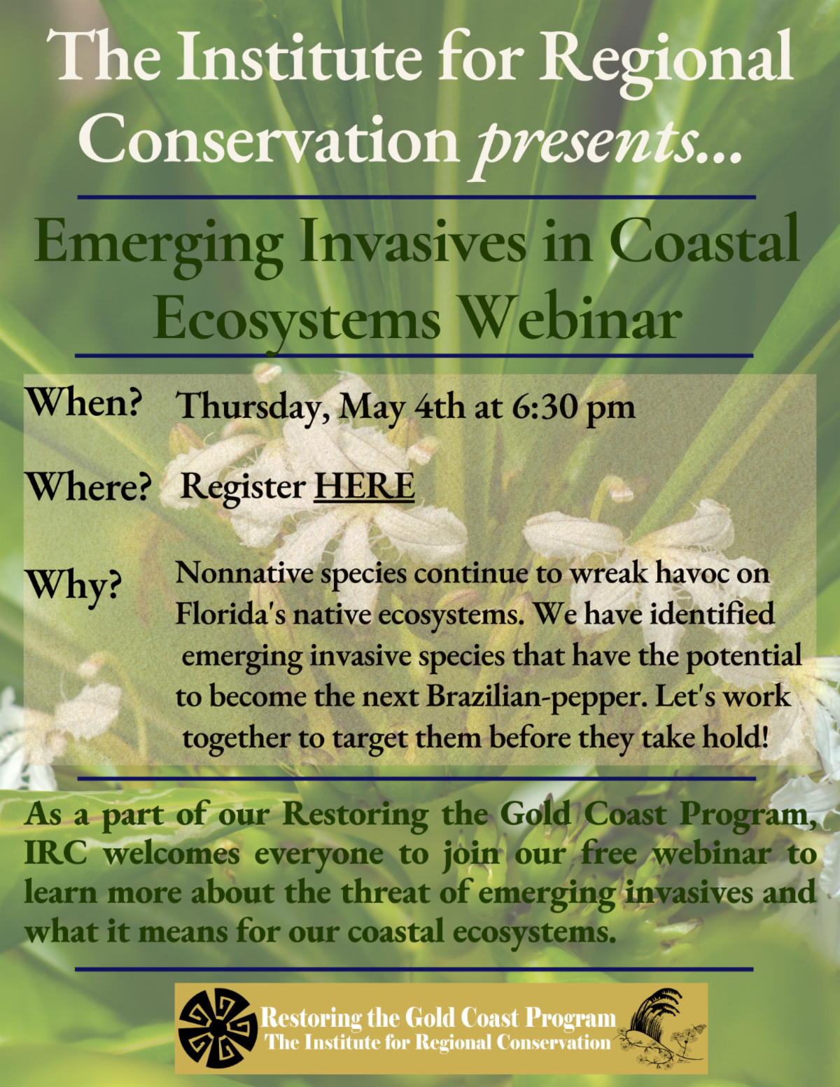 IRC is excited to host a free, virtual webinar on Thursday, May 4 at 6:30PM that will focus on the identification of several "emerging invasive" plant species (including at least one you will know!) that we at IRC have identified. We will discuss how to report your observations of these species to best influence the change that is needed. Although we are highlighting emerging invasive species for Palm Beach County, but we encourage people from all throughout Florida to join the webinar and learn with us!