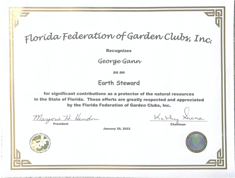 | IRC’s Chief Conservation Strategist and Executive Director, George Gann, was a speaker at “Gardening for Life,” the 65th Annual Tropical Short Course, National Garden Club Tri-Refresher where he gave a talk on Natives For Your Neighborhood and “Why Planting Local Matters”. While there, George was honored with a certificate of recognition as an Earth Steward from the Florida Federation of Garden Clubs, Inc. Thank you to Barbara Hadsell for inviting George to the talk and to Marjorie Hendon, FFGC President, and Kathy Siena FFGC Chairman, for the award.