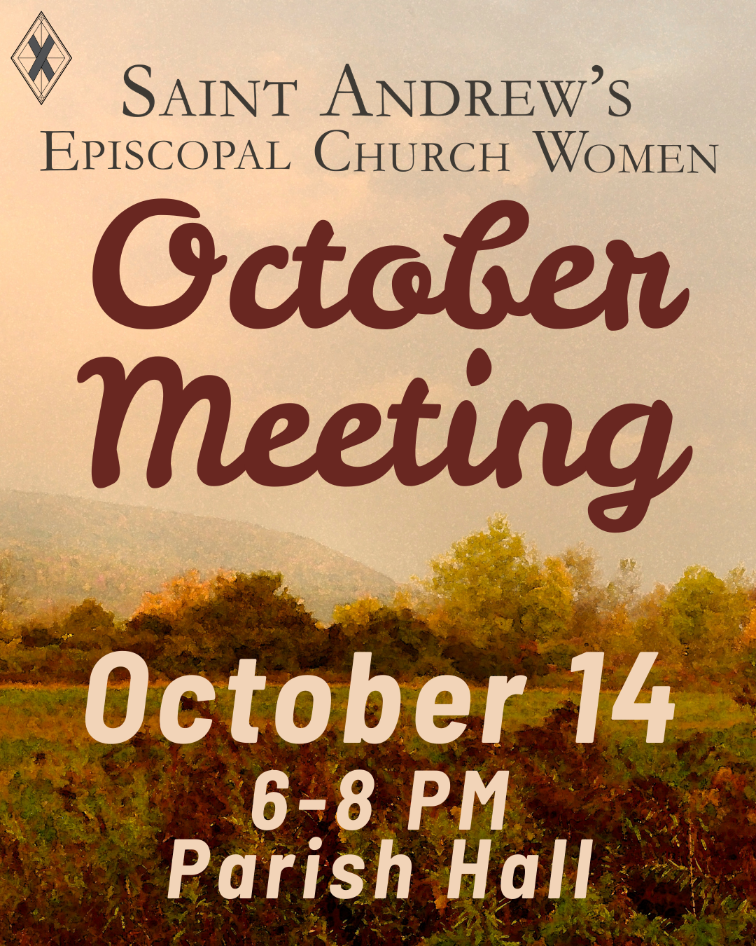 On Tuesday, October 14, ECW (Episcopal Church Women) will meet at 6 PM in the Parish Hall. Fr. Gary and Cheryl Banks will join us to share about Saint Andrew's Catechesis of the Good Shepherd Ministry, and we will enjoy a soup bar dinner with breads and dessert.