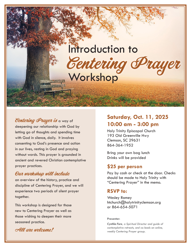 This fall, parishioner Cynthia Fore is presenting the "Introduction to Centering Prayer Workshop" at Holy Trinity Episcopal Church, Clemson. Additional information and RSVP details can be found below.
