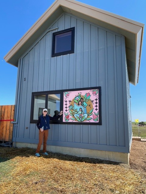 (Photo: Chapter member Phylliss Kerr poses in front of a native artist mural painted on the side of one of the homes.)