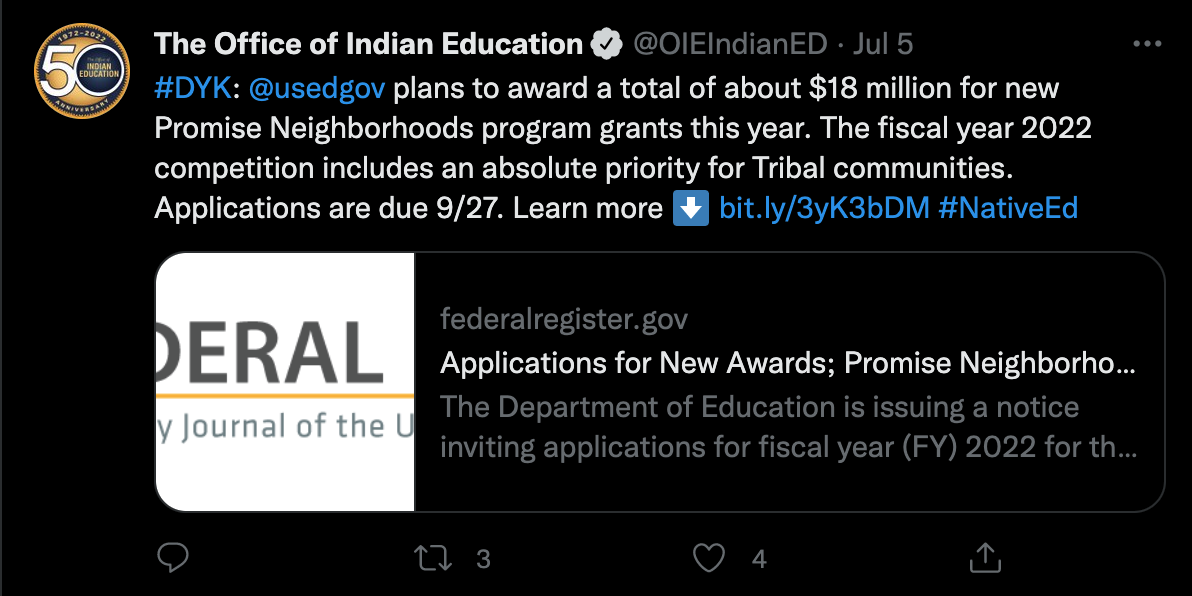 This is a reminder that you receive this email as a grantee of the Office of Indian Education or because you requested to join the OIE Newsletter distribution list. Don't forget to add OIE@seiservices.com to your address book so we'll be sure to land in your inbox! |