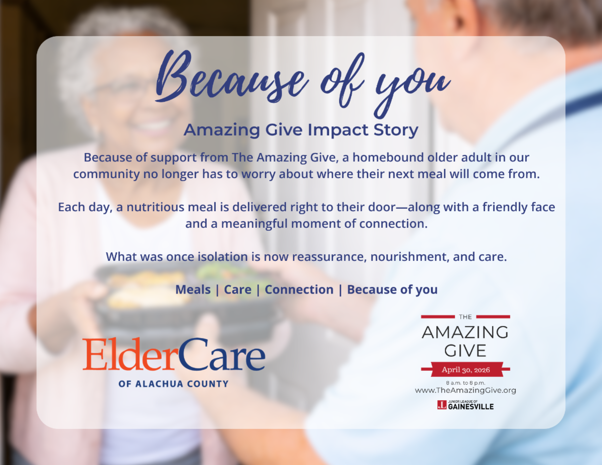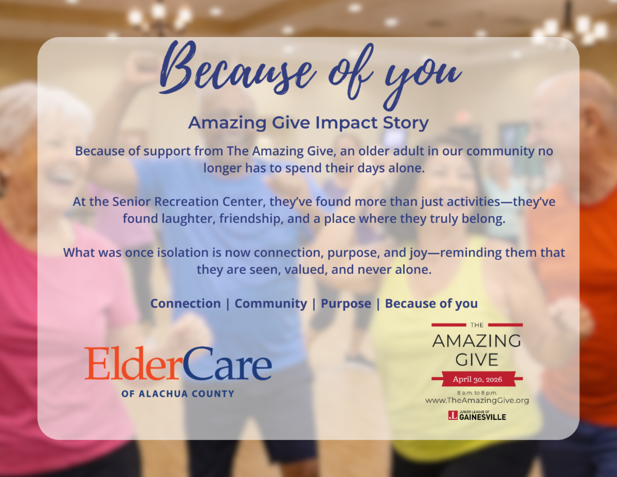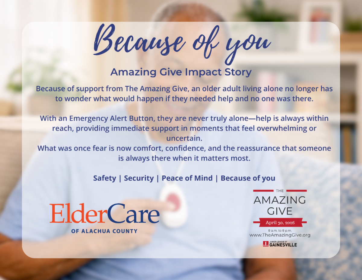 At ElderCare of Alachua County, your support helps us continue our mission to be an advocate for older adults by providing services that build capacity, maximize independence, and enrich quality of life.