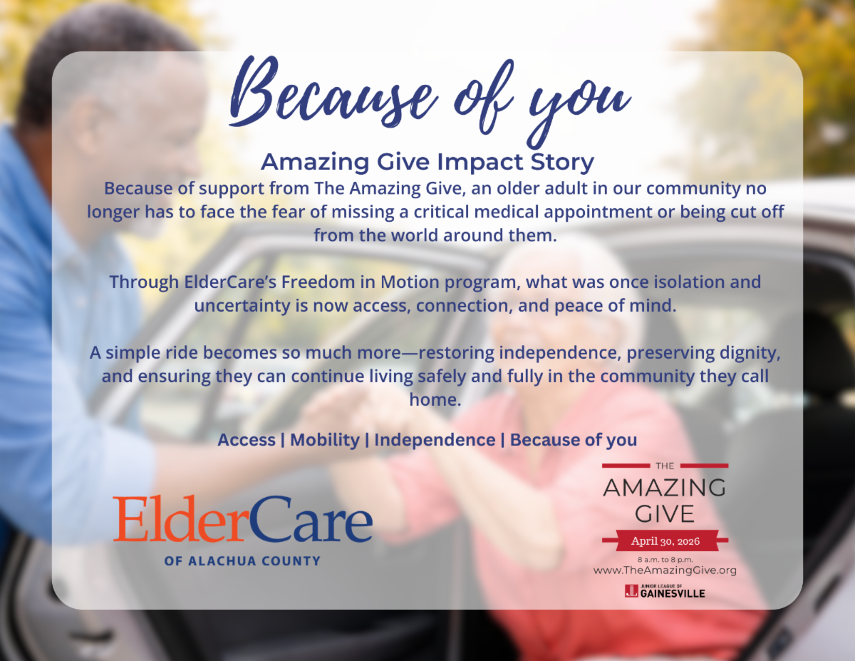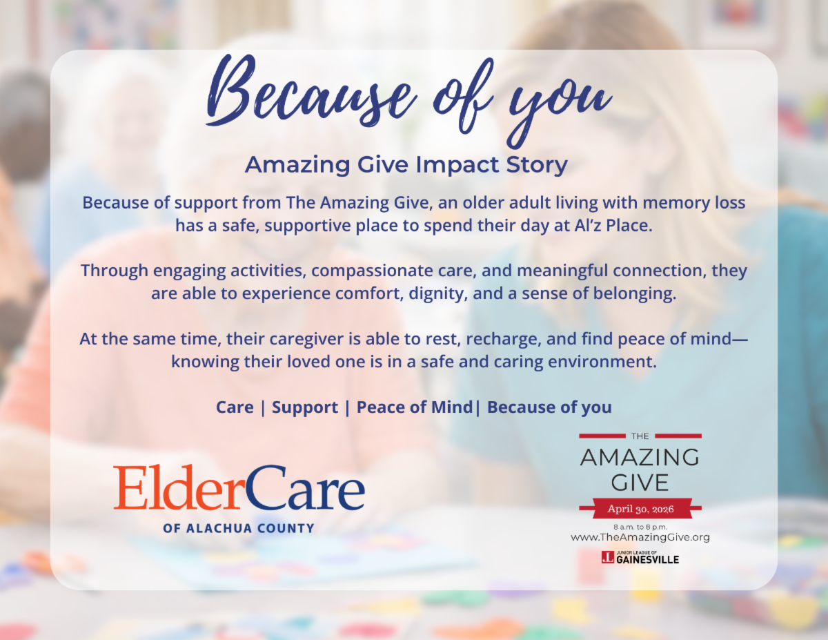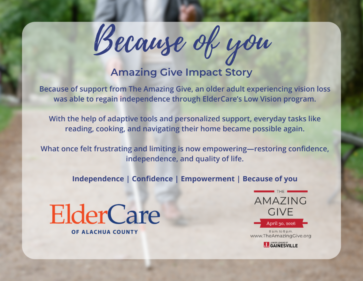 At ElderCare of Alachua County, your support helps us continue our mission to be an advocate for older adults by providing services that build capacity, maximize independence, and enrich quality of life.