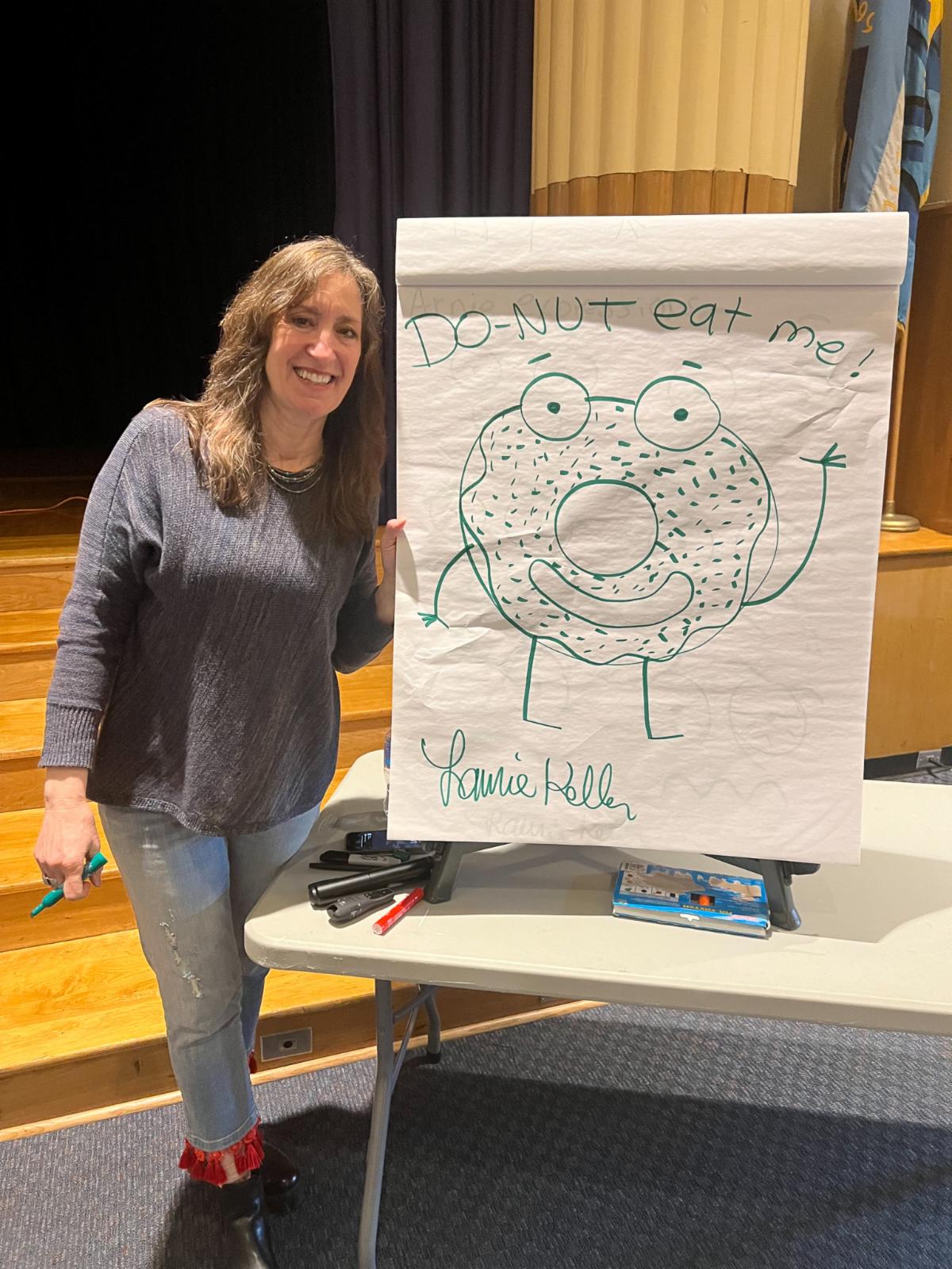 And then on Thursday, March 16th, Davis kindergarten, first and second graders welcome author Laurie Keller. Ms. Keller has written popular children's books such as, Arnie the Doughnut and The Scrambled States of America. Ms. Keller took each grade through a drawing activity during their assembly. where students learned how to make our character expressions come alive with subtle details.