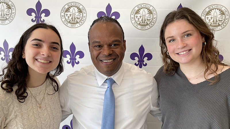 | | Leah (left) and Julia with New Rochelle High School principal Dr. Dagoberto Artiles. | |