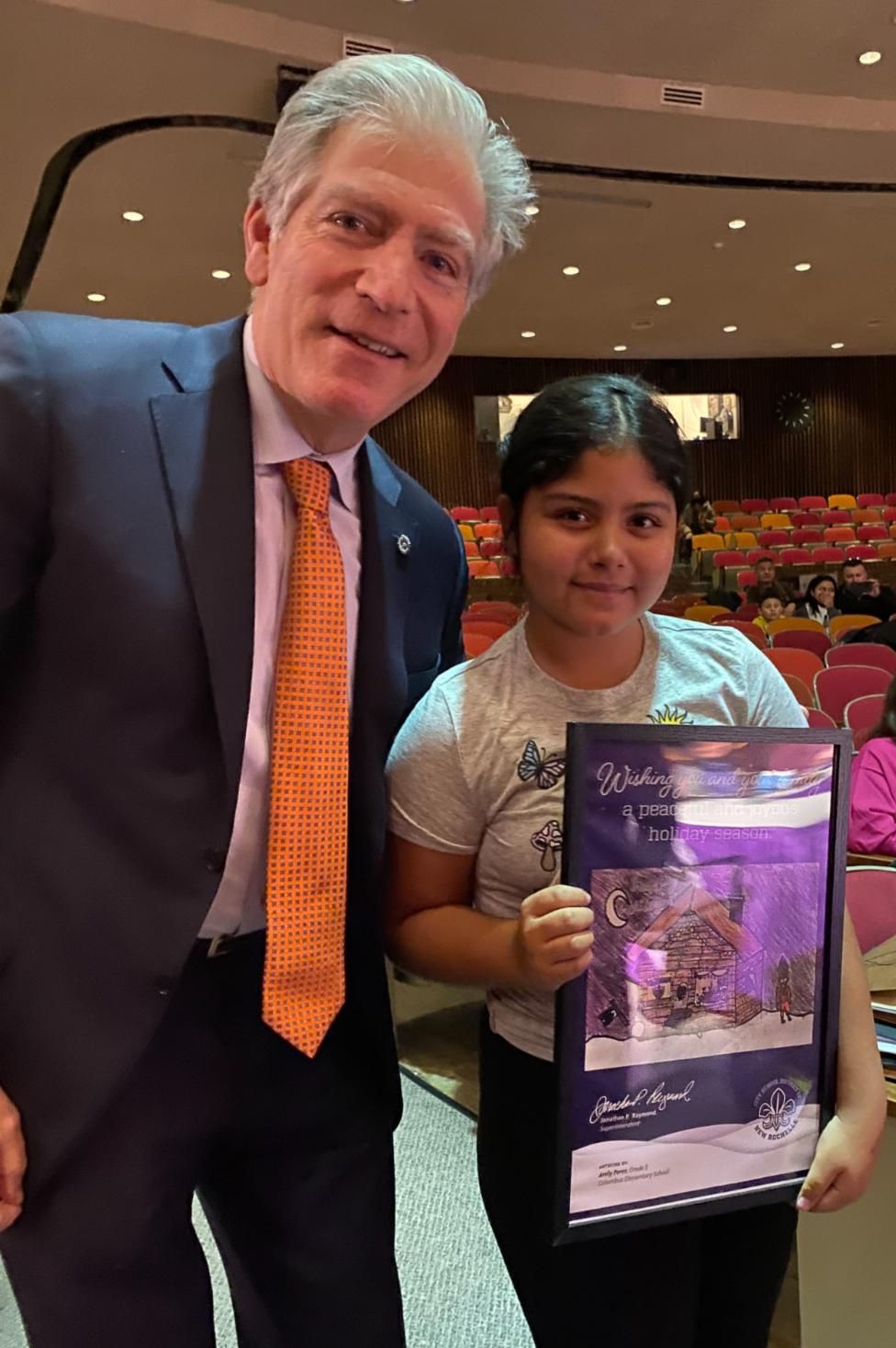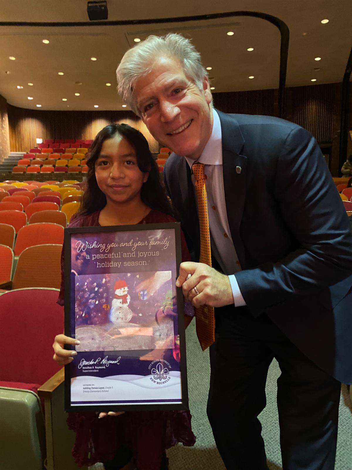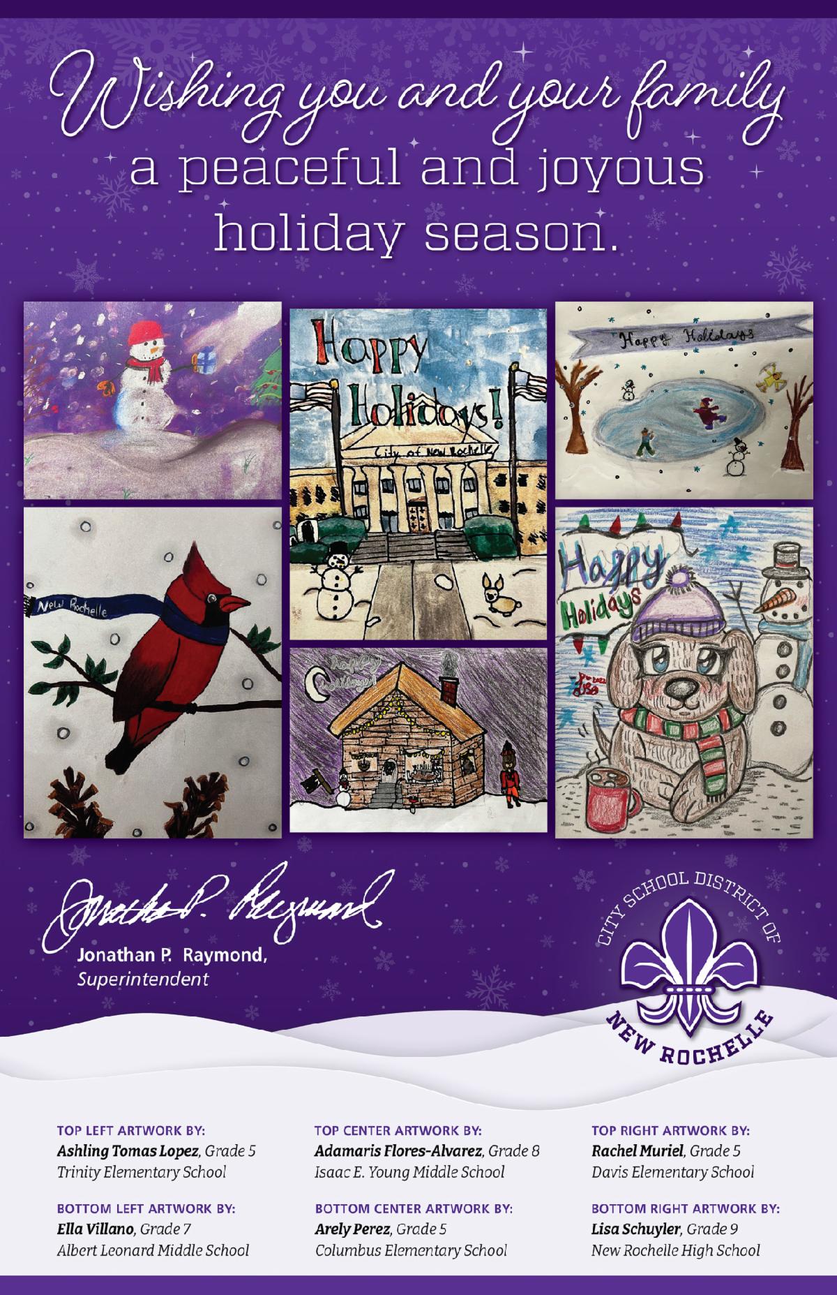 Entries were first considered by a panel of teachers who selected finalists before being sent to City Hall where Central Administration Office staff agonized over narrowing the winners to just six. The winning pieces of art have been compiled into a holiday greeting that will be sent to nearly 20,000 City School District of New Rochelle students, families, community members, and supporters.