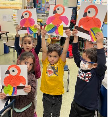 In this session, the students read four books, concluding with “Mango, Abuela and Me.” They labeled classroom objects with pre-made labels to go along with the story and created parrots to represent characters in the book, using cupcake liners.
