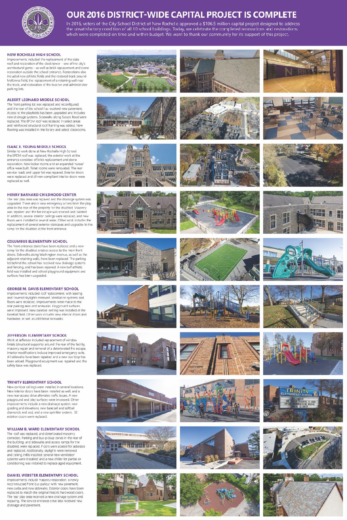The project included a wide range of work, such as improved drainage, removal of underground oil tanks and replacement with new above ground tanks at several schools, the restoration of the grand entrance stairway at Columbus and the new slate roof and renovated clock tower at New Rochelle High School. Brightly colored playground equipment was installed at several elementary schools and gymnasiums across the district now have gleaming new floors. New locker rooms, bus drop off areas and athletic fields were also included.