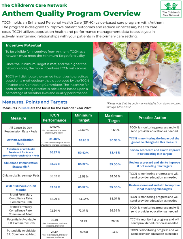 Thank you all again for your continued hard work over the past two years. With your help, we have seen significant success throughout our participation in the Anthem Quality Program. In 2021, TCCN received incentive distributions as a result of meeting network quality performance metrics. At this time, we are waiting on Anthem to send our final performance metrics for 2022. As soon as this information is received, we will be sure to send an updated communication sharing our wins for the previous year!
