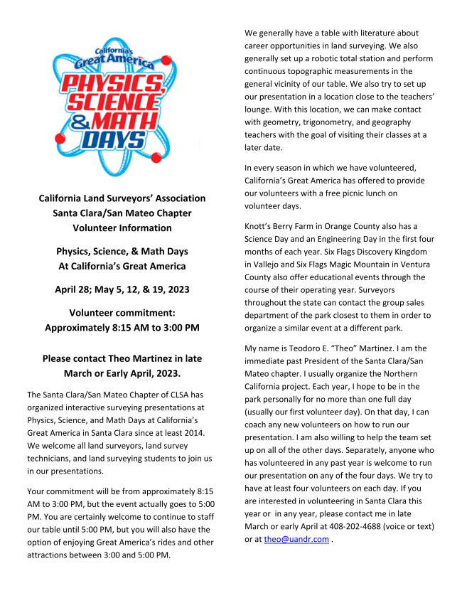 Great America in Santa Clara since at least 2014. We welcome all land surveyors, land survey technicians, and land surveying students to join us in our presentations.