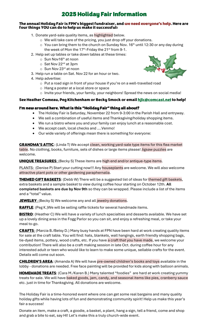 The annual First Parish of Norwell Holiday Fair is quickly approaching on (November 22)