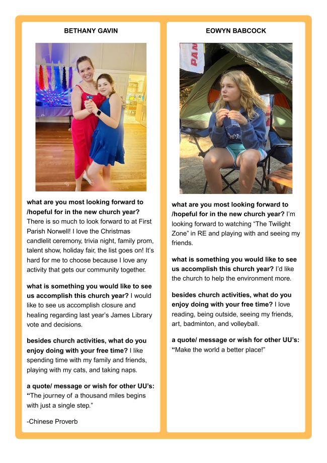 New Staff: Our year of learning about the UU values is off to a great start in Religious Exploration, with two new staff members rounding out our team and four classes offered every Sunday morning for young people.