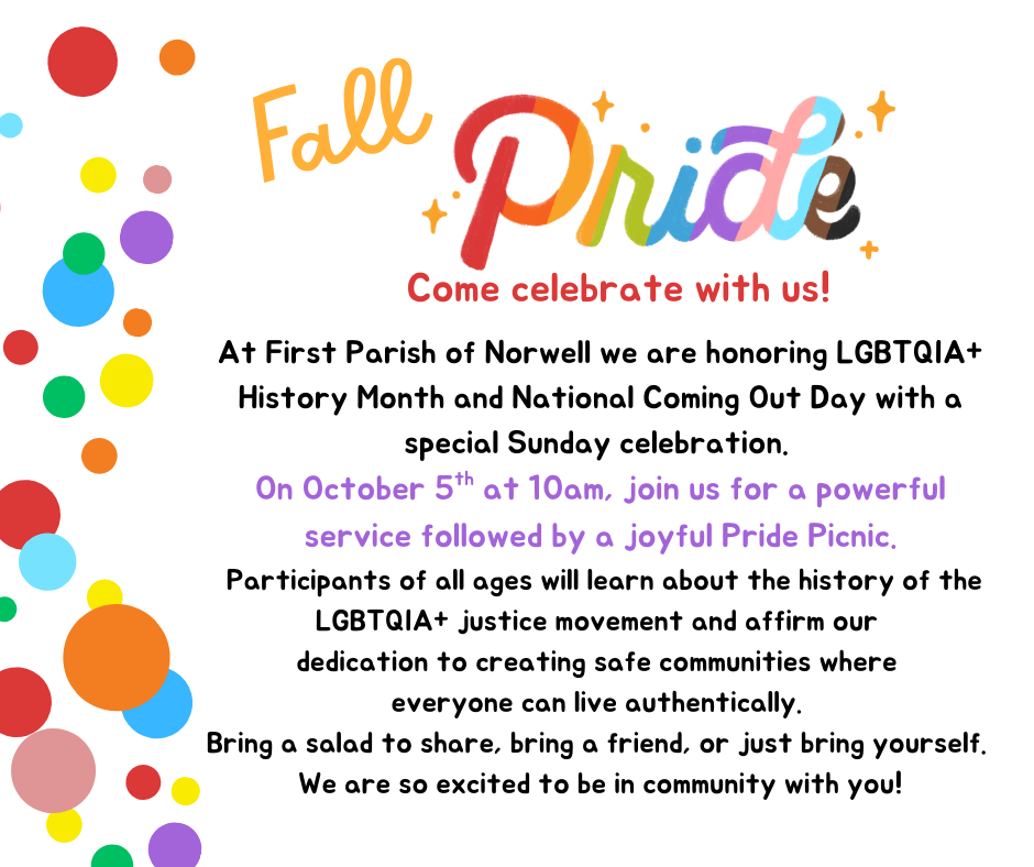 Join us and bring a friend for our Fall Pride worship service. Using the words of Bayard Rustin, we will explore the history of the LGBTQ movement in our country and in the Unitarian Universalist faith. In an era where the rise of queer and transphobia is being used as a platform by political and religious leaders alike, how do we become a safe haven and a fierce advocate for our beloveds whose very existence is being threatened? How do we more visibly show our value of equity across the South Shore?