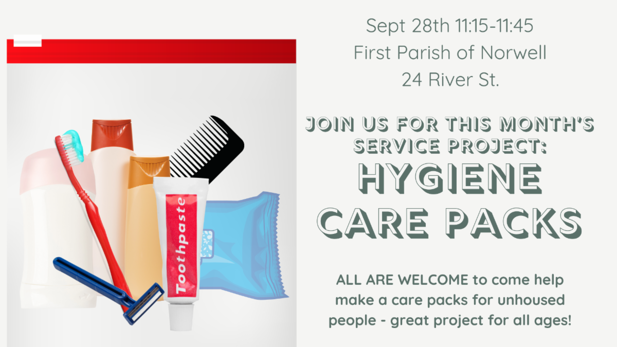 This Sunday, come help us create 150 hygiene care packs for unhoused people. In just half an hour, you'll hear a quick explanation of why these kits are needed and how hygiene is essential to dignity.
