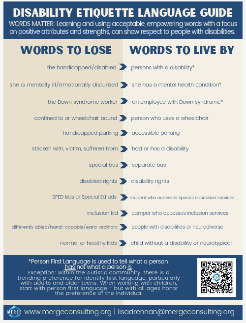 Here’s a guide she shared with us for using the most respectful language when discussing disabilities. Remember, “disability” is not a “bad word,” and you can choose words thoughtfully to confer dignity to everyone.